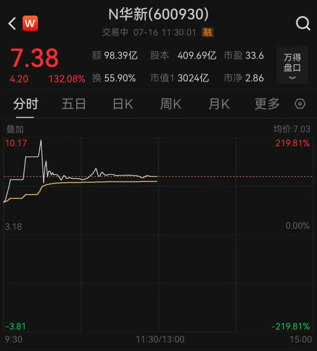 7月16日,千亿市值新股华电新能首发上市(600930,上市首日证券简称为“N华新”),盘中一度涨到10元上方,较发行价大涨近220%。上市1小时内,该股成交额已超过80亿元。截至午市收盘,其股价报7.38元/股,涨132.08%。