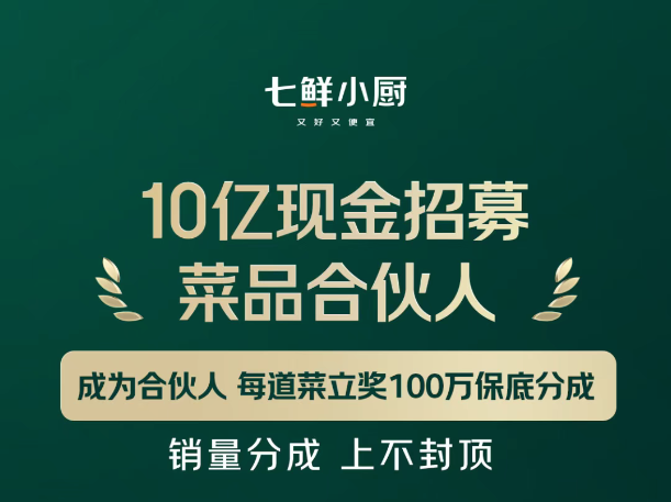 据了解,在全新的供应链模式下,合伙人仅需提供菜品配方并参与研发,由合营品质餐饮制作平台七鲜小厨承担现炒制作及严格品控,以外卖、自提两种形式销售。竞选胜出成为每道菜品的合伙人后,可直接获得100万元现金保底分成,后续该菜品的销售分成上不封顶。