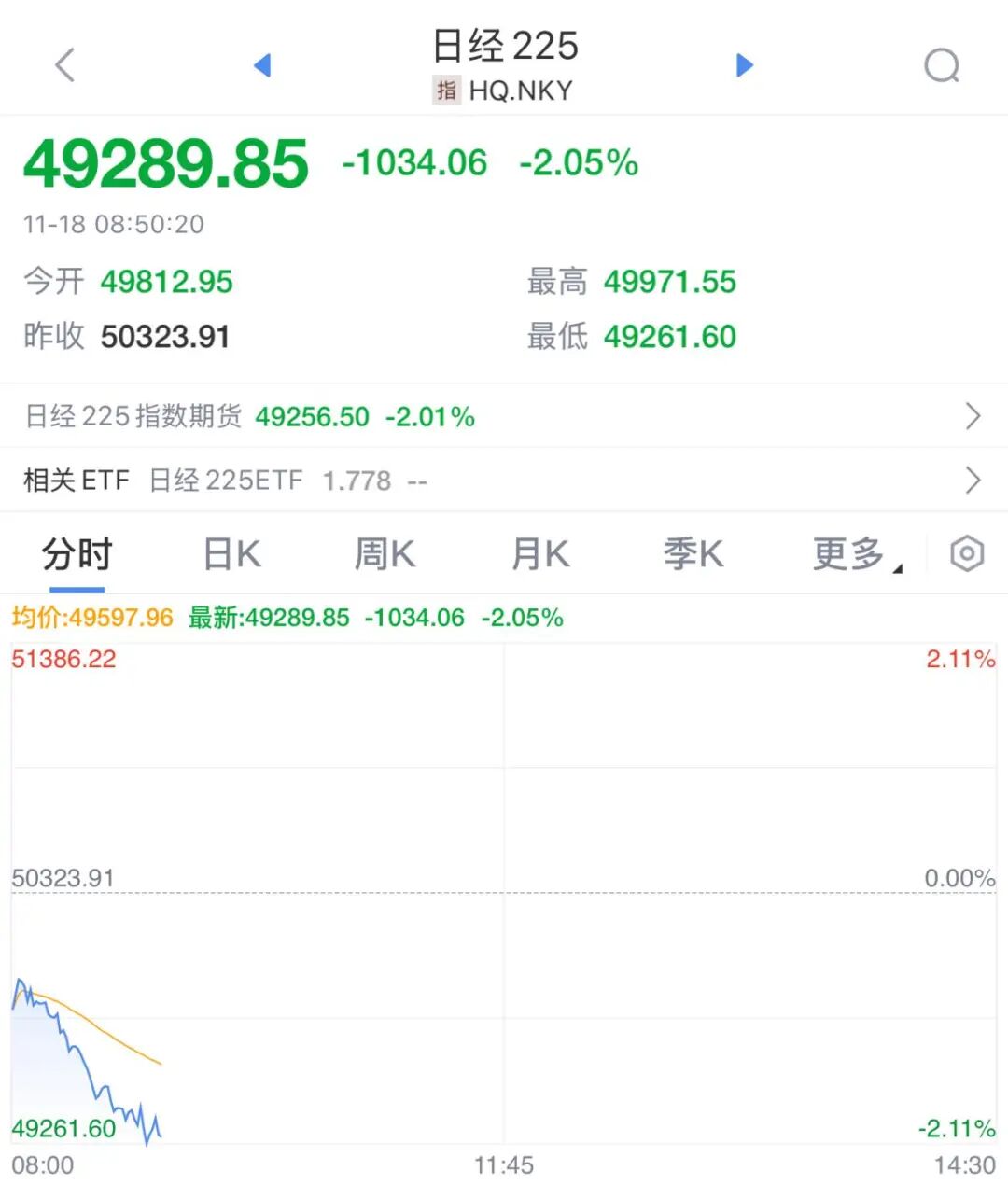 11月18日,日本股市开盘再度走低,日经225指数下跌超1000点,跌幅超2%。