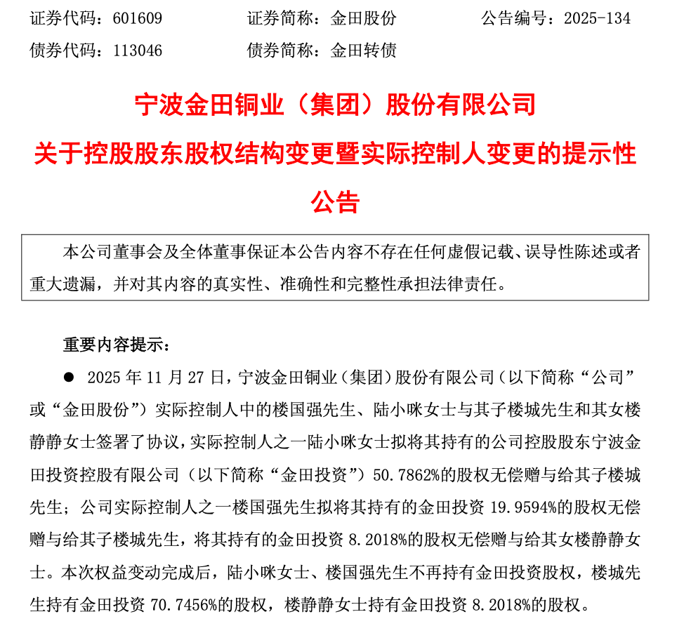 11月29日,金田股份(601609)披露,公司控股股东宁波金田投资控股有限公司(下称“金田投资”)的股权结构将发生变更。据悉,公司实际控制人中的楼国强、陆小咪夫妇与其子楼城和其女楼静静签署了协议,陆小咪、楼国强拟分别将其持有的金田投资50.7862%、19.9594%的股权无偿赠与给楼城;同时,楼国强拟将其持有的金田投资8.2018%的股权无偿赠与给楼静静。