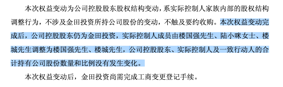 上市公司表示,此次权益变动系公司实际控制人家族内部的股权结构调整行为,不涉及金田投资所持公司股份的变动,不触及要约收购。权益变动后,公司控股股东仍为金田投资,实际控制人成员由楼国强、陆小咪、楼城调整为楼国强(其仍直接持有金田股份18.63%的股份)、楼城。公司控股股东、实际控制人及一致行动人的合计持有公司股份数量和比例没有发生变化。