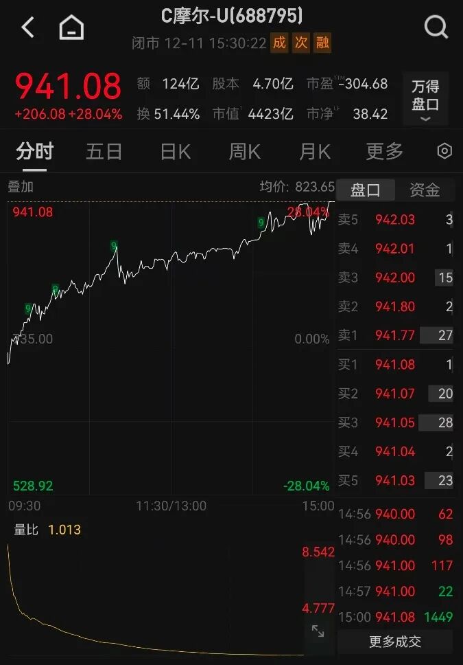 具体来看,摩尔线程于2025年12月5日在上海证券交易所科创板上市,截至12月11日,公司股票收盘价格较发行价格涨幅为723.49%。其中,摩尔线程12月11日当日涨幅超28%。