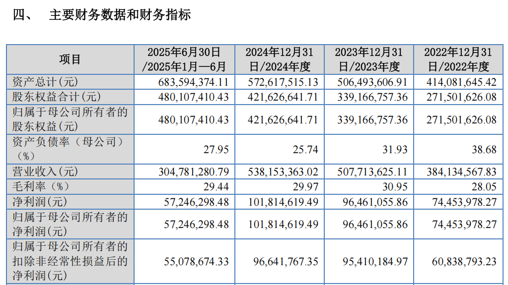 2022年至2024年及2025年上半年,江天科技的营业收入分别为3.84亿元、5.07亿元、5.38亿元及3.05亿元,归母净利润分别为7445.40万元、9646.11万元、1.02亿元及5724.63万元。