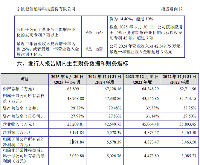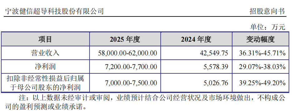 招股意向书显示,受益于无液氦超导产品收入放量增长、重点客户合作持续深入,以及国内医疗设备采购需求逐步释放等因素,健信超导预计其2025年全年的营业收入为5.80亿元至6.20亿元,同比增长36.31%至45.71%;扣非后净利润为7000万元至7500万元,同比增长39.25%至49.20%。
