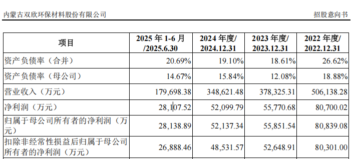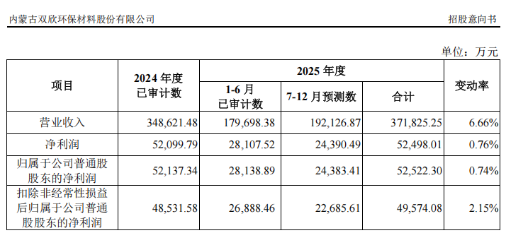 招股意向书显示,双欣环保预计其2025年全年的营业收入为37.18亿元,同比增长6.66%;扣非后净利润为4.96亿元,同比增长2.15%。