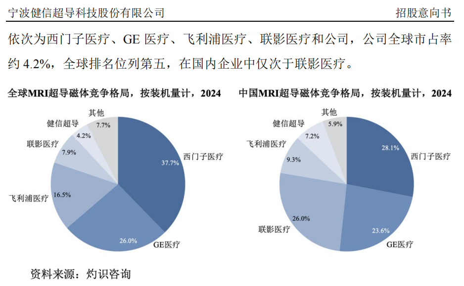 根据灼识咨询数据,以装机量口径统计,2024年全球超导磁体前五名厂商依次为西门子医疗、GE医疗、飞利浦医疗、联影医疗和健信超导,其中健信超导的全球市占率约为4.2%,在国内仅次于联影医疗。