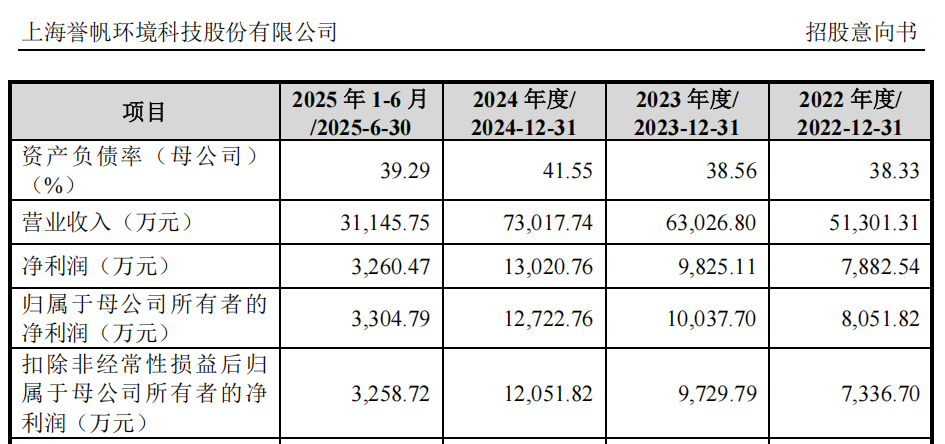 招股意向书显示,誉帆科技预计其2025年全年的营业收入为8.04亿元,同比增长10.16%;扣非后净利润为1.37亿元,同比增长13.84%。