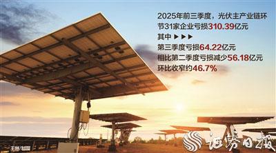 中国光伏行业协会发布的数据显示,2025年前三季度,光伏主产业链环节31家企业营业收入同比下降16.9%,其中第三季度同比下降11.7%,环比下降约5%。不过,主产业链环节盈利能力逐渐改善,企业亏损持续收窄。2025年前三季度,光伏主产业链环节31家企业亏损310.39亿元,其中第三季度亏损64.22亿元,相比第二季度亏损减少56.18亿元,环比收窄约46.7%。