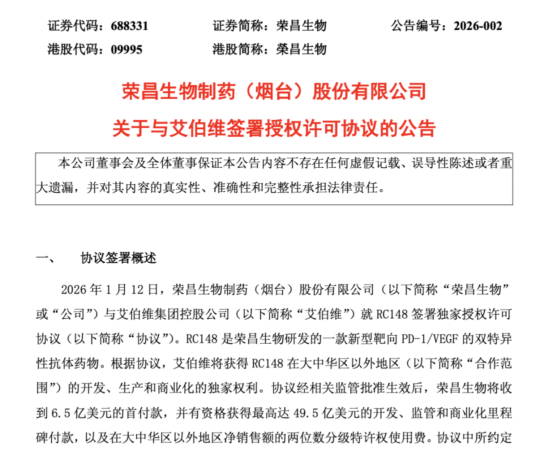1月12日晚间,荣昌生物(688331)宣布,与跨国药企艾伯维就荣昌生物自主研发的新型靶向PD-1/VEGF双特异性抗体药物RC148签署独家授权许可协议。
