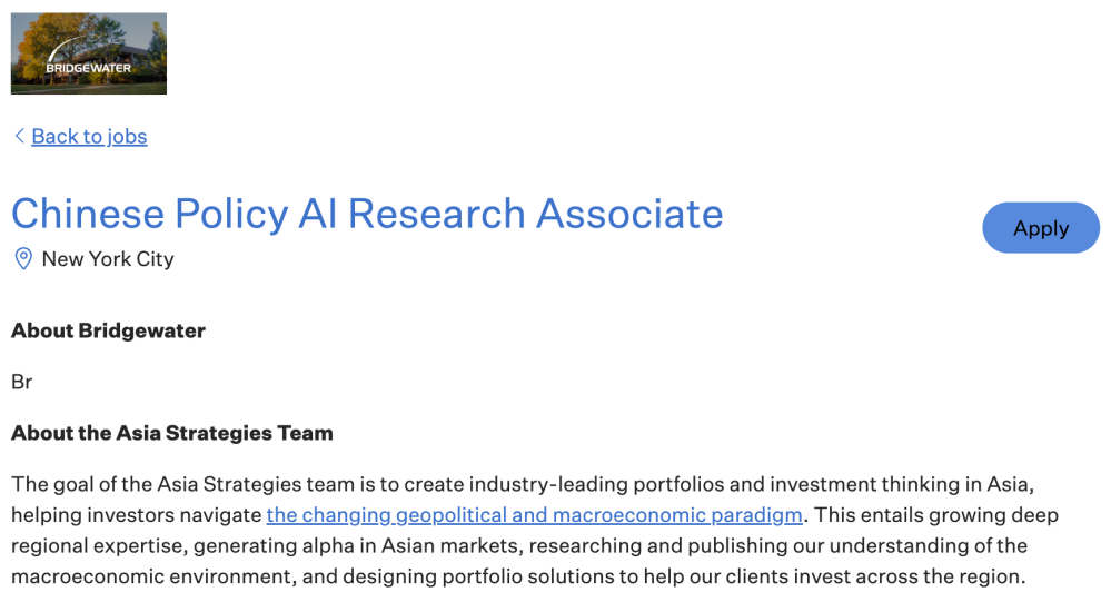 近期,桥水在官方渠道发布一则“中国政策AI研究助理”的岗位招聘:工作地点在纽约,要求普通话流利,能够熟练运用人工智能(AI)与大语言模型(LLMs);年度底薪16万美元至22.5万美元,另有浮动奖金。