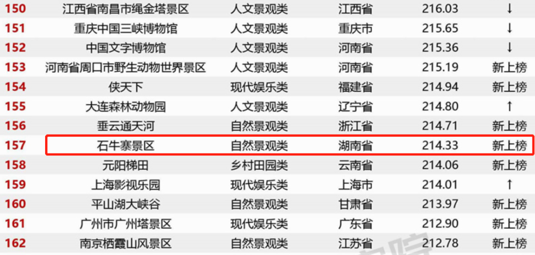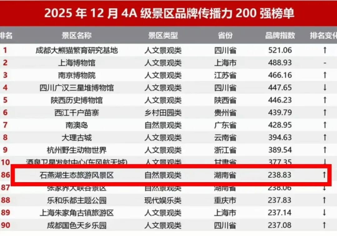 2026年1月21日,文旅大数据中心迈点研究院发布了《2025年12月4A级景区品牌传播力200强榜单》,中惠旅集团旗下景区表现亮眼,成绩斐然!长沙石燕湖景区在激烈的竞争中脱颖而出,排名全国第86位,在华中地区更是跻身TOP10,彰显出强劲的品牌影响力和市场竞争力。岳阳平江天岳石牛寨景区新上榜单,取得全国第157名的佳绩 ,令人瞩目。