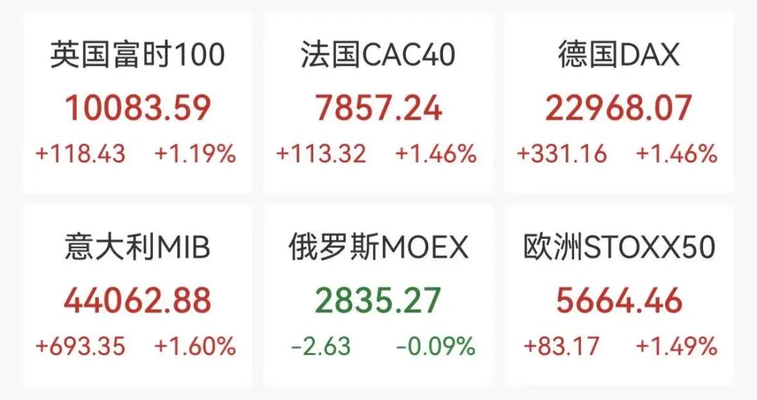 3月25日,欧洲主要股市开盘后全线走高,截至发稿,欧洲斯托克50指数涨1.49%,德国dax(GDAXI)指数涨1.46%,英国富时100指数(FTSE)涨1.19%,法国cac40(FCHI)指数涨1.46%。