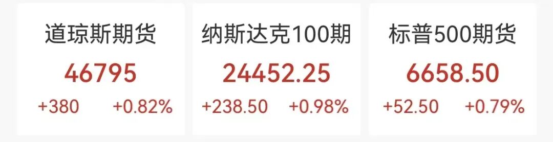 美国股指期货集体上涨,截至发稿,道琼斯指数期货涨0.82%,纳斯达克100(NDX)指数期货涨0.98%,标普500(SPX)指数期货涨0.79%。