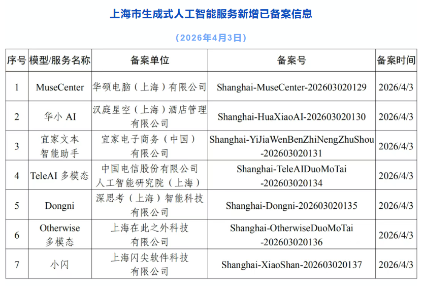 上证报中国证券网讯 据上海市网信办4月3日消息,截至4月3日,上海市新增7款已完成备案的生成式人工智能(885728)服务,累计已完成157款生成式人工智能(885728)服务备案。